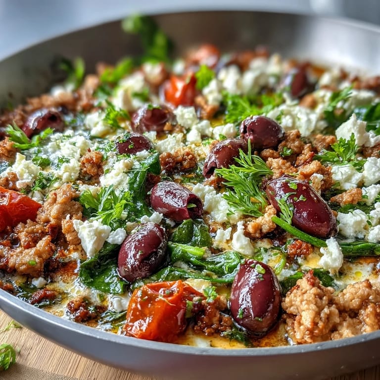 Save My sister texted me a photo of her skillet dinner one Tuesday night, no recipe, just the words "threw stuff together." The colors caught me first: deep purple olives, bright red tomatoes, creamy white feta scattered on top like snow. I recreated it the next evening using ground chicken I had thawed that morning, and by the time I squeezed lemon over the whole thing, I understood why she sent that photo. Sometimes the best meals aren't planned, they just happen when you trust your instincts and let Mediterranean flavors do the work.